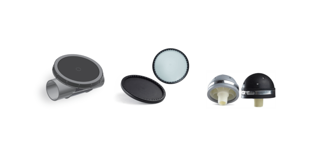 Jak bylo již zmíněno, naše aerační systémy osazujeme elementy od výrobců EDI a SSI a to v ve všech možných provedení: kruhové, trubicové paralelně i sériově řazené, atd.. Materiálová provedení těl jednotlivých typů elementů jsou neustále vyvíjeny. Např. nejrozšířenější kruhové elementy jsou vyráběny z polypropylenu vyztuženého skelným vláknem.